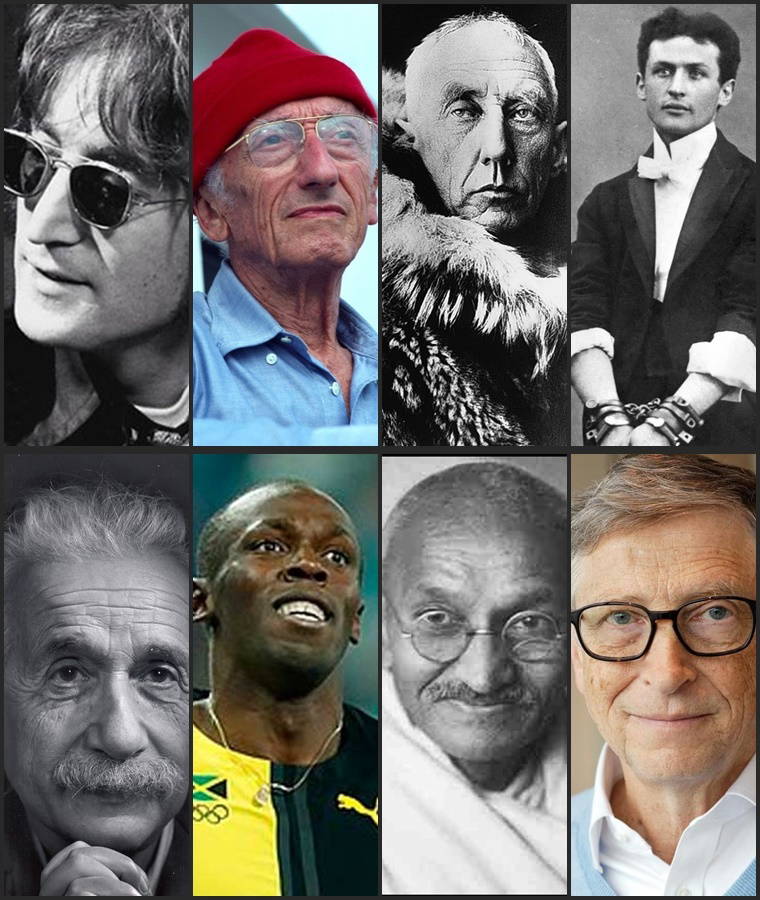 Alan Turing, Albert Casals, Albert Einstein, Albert Espinosa, Andre Agassi, Antoine de Saint-Exupéry, Barack Obama, Bill Gates, Bobby Fischer, Charles Darwin, Che Guevara, Dalay Lama, Félix Rodríguez de la Fuente, Haile Gebrselassie, Harry Houdini, Harvey Milk, İkbal Mesih, Isaac Newton, Jacques Yves Cousteau, Jamie Oliver, John Lennon, Jules Verne, Kelvin Doe, Kílian Jornet, Leonardo Da Vinci, Lili Elbe, Lionel Messi, Louis Braille, Ludwig Van Beethoven, Mahatma Gandhi, Martin Luther King, Mesud Hasani, Nelson Mandela, Nikola Tesla, Oskar Schindler, Paul Poiret, Pedro Duque, Primo Levi, Rudolf Nureyev, Roald Amundsen, Sebastião Salgado, Shigeru Ban, Stephen Hawking, Steve Irwin, Steven Spielberg, Tenzing Norgay, Usain Bolt, Vicente Ferrer, William Shakespeare, Wolfgang Amadeus Mozart...