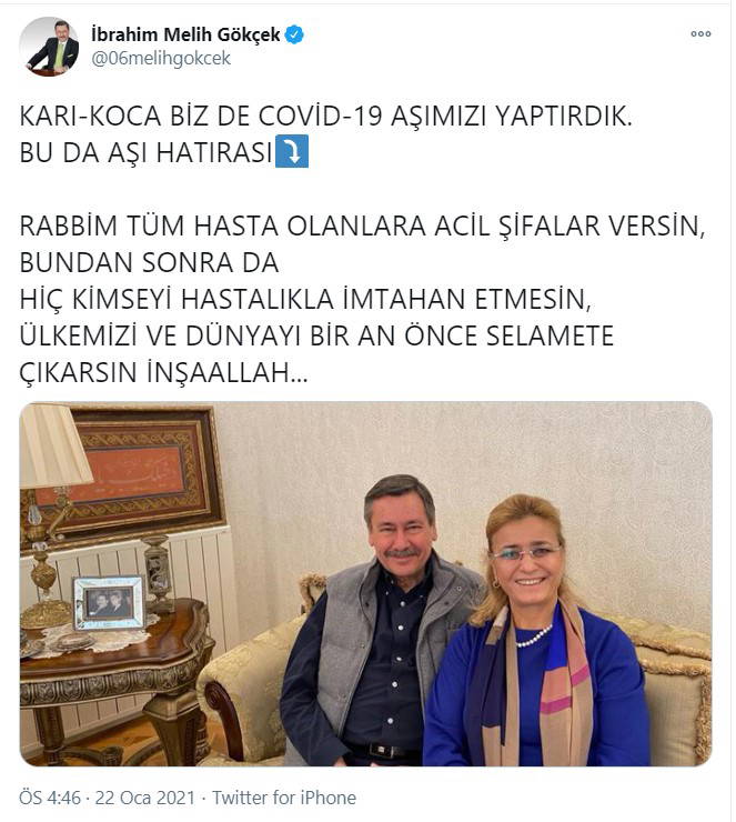 72 yaşındaki Melih Gökçek, Twitter hesabından yaptığı açıklamada, 66 yaşındaki eşi Nevin Gökçek ile birlikte koronavirüs aşısı yaptırdığını açıkladı.