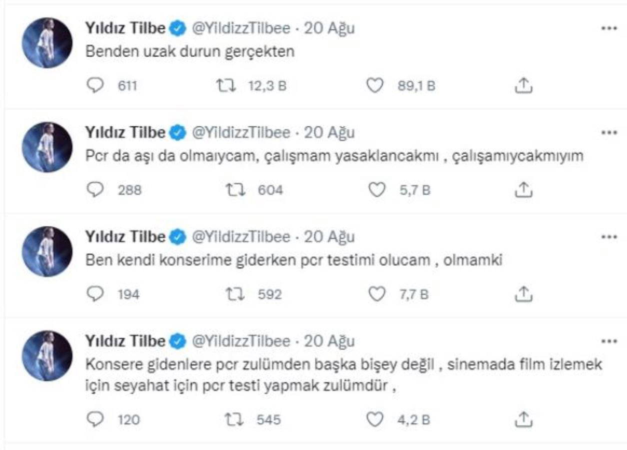 Yıldız Tilbe’nin aşı karşıtı ifadeleri kamuoyunda tepki çekmişti. Ünlü şarkıcı, aşı ve PCR testi ile ilgili yaptığı paylaşımlarda şu ifadeleri kullanmıştı: