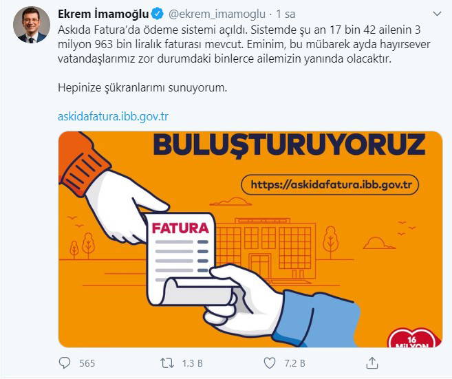 İmamoğlu sosyal medya hesabı Twitter'dan “Askıda Fatura'da ödeme sistemi açıldı. Sistemde şu an 17 bin 42 ailenin 3 milyon 963 bin liralık faturası mevcut. Eminim, bu mübarek ayda hayırsever vatandaşlarımız zor durumdaki binlerce ailemizin yanında olacaktır” paylaşımında bulundu.