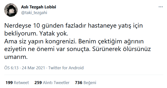 "Nerdeyse 10 günden fazladır hastaneye yatış için bekliyorum. Yatak yok. Ama siz yapın kongrenizi. Benim çektiğim ağrının eziyetin ne önemi var sonuçta. Sürünerek ölürsünüz umarım"