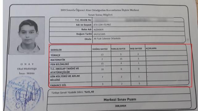 Anne Yılmaz, “İlk evrakta Türkçeden 18, Matematik’ten 17, Fen Bilimlerinden 18, İnkılap Tarihinden 10, Din Kültüründen 8, Yabancı Dilden ise 5 doğru görünürken okula gittiğimizde verilen evrakta doğru sayısı Türkçeden 13’e, Matematikten 2’ye, Fen Bilimlerinden 15’e Din Kültüründen 7’ye, Yabancı Dilden ise 3’e düşmüş. Sınavdan sonra oğlum soruları kontrol etmişti. Kontrol ettiğinde ilk netleri tutuyor ancak sonrasında tutmuyor” dedi.