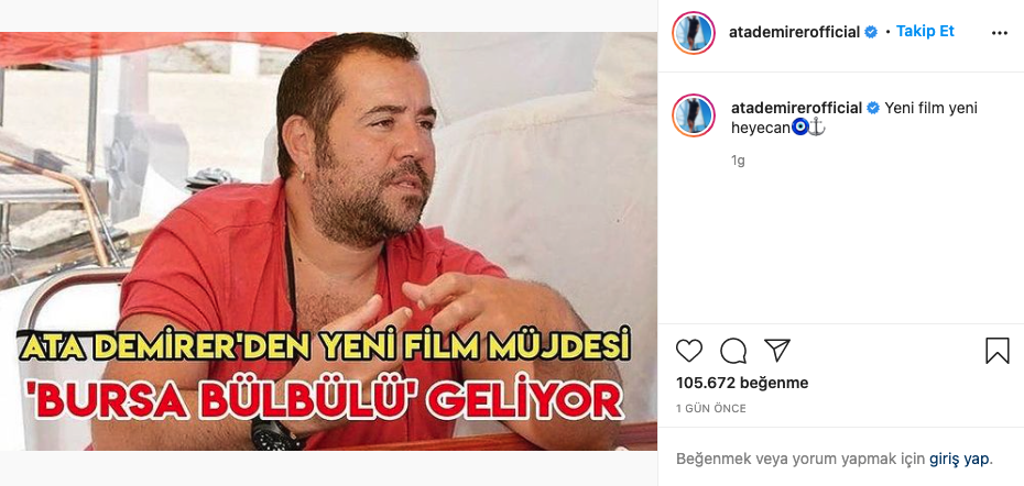 Komedyen ve oyuncu Ata Demirer, ‘Bursa Bülbülü’ adlı yeni filmiyle ilgili Instagram hesabından paylaşım yaptı.