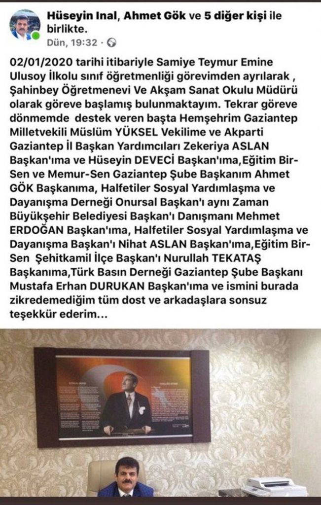 Samiye Teymur Emine Ulusoy İlkokulunda sınıf öğretmeni olarak görev yapan Hüseyin İnal, Şahinbey Öğretmenevi ve Akşam Sanat Okulu Müdürlüğüne atandı.