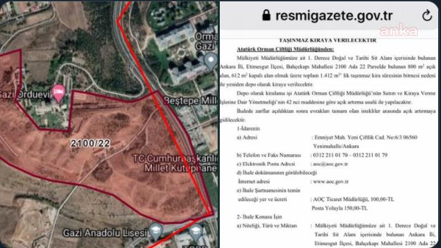 Resmi Gazete'de yayımlanan ilanda, kira sözleşmesi biten 1.412 metre karelik Atatürk Orman Çiftliği arazisinin açık ihale usulüyle 5 yıllığına yeniden kiraya verileceği duyuruldu. Aylık 7.500.00 liraya kiraya verilen alan 28 Ocak 2021'de ihaleye açılacak.