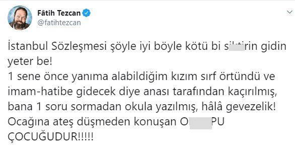 Daha sonraki paylaşımında İstanbul Sözleşmesi'ni savunanlara küfür eden Tezcan, " İstanbul Sözleşmesi şöyle iyi böyle kötü bi s.ktirin gidin yeter be! 1 sene önce yanıma alabildiğim kızım sırf örtündü ve imam-hatibe gidecek diye anası tarafından kaçırılmış, bana 1 soru sormadan okula yazılmış, hâlâ gevezelik! Ocağına ateş düşmeden konuşan O… Çocuğudur" dedi.