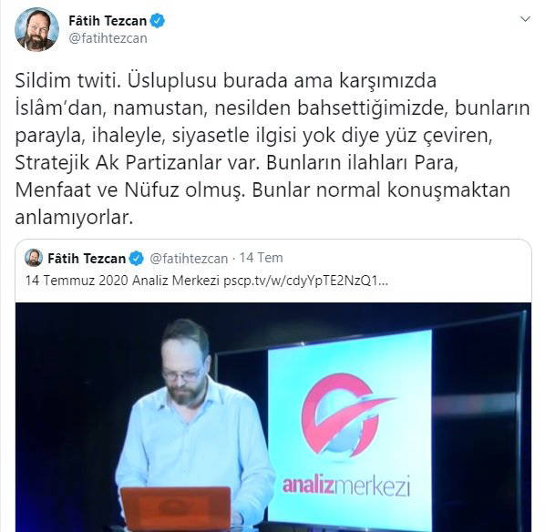 Üsluplusu burada ama karşımızda İslâm'dan, namustan, nesilden bahsettiğimizde, bunların parayla, ihaleyle, siyasetle ilgisi yok diye yüz çeviren, Stratejik Ak Partizanlar var. Bunların ilahları Para, Menfaat ve Nüfuz olmuş. Bunlar normal konuşmaktan anlamıyorlar.