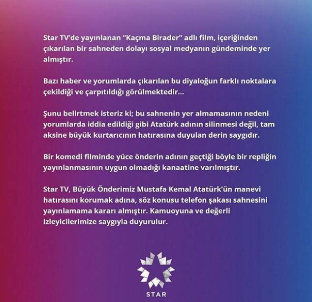 Star TV, Büyük Önder'imiz Mustafa Kemal Atatürk'ün manevi hatırasını korumak adına, söz konusu telefon şakası sahnesini yayınlamama kararı almıştır. Kamuoyuna ve değerli izleyicilerimize saygıyla duyurulur.