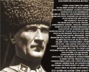 ''İşte Türkiye'de bir Ergenekon karmaşası yürütülürken Atatürk'ün Bursa nutku yeniden gündemdedir. Çünkü bugün Türkiye'deki mahkemelerin bazılarına da ne demek gerektiğini bize Mustafa Kemal Atatürk 6 Şubat 1933'te Bursa'da söylemişti. Atatürk'ün Bursa nutkuna ihtiyacımız her zamankinden daha fazladır. Bu nedenle nutkunu tekrar dalga dalga yayacağız. Ne biz unutacağız ne gençlerimiz unutacak ne de Atatürk devrimlerini yaşatma kararlılığında olanlar unutabilecek.''