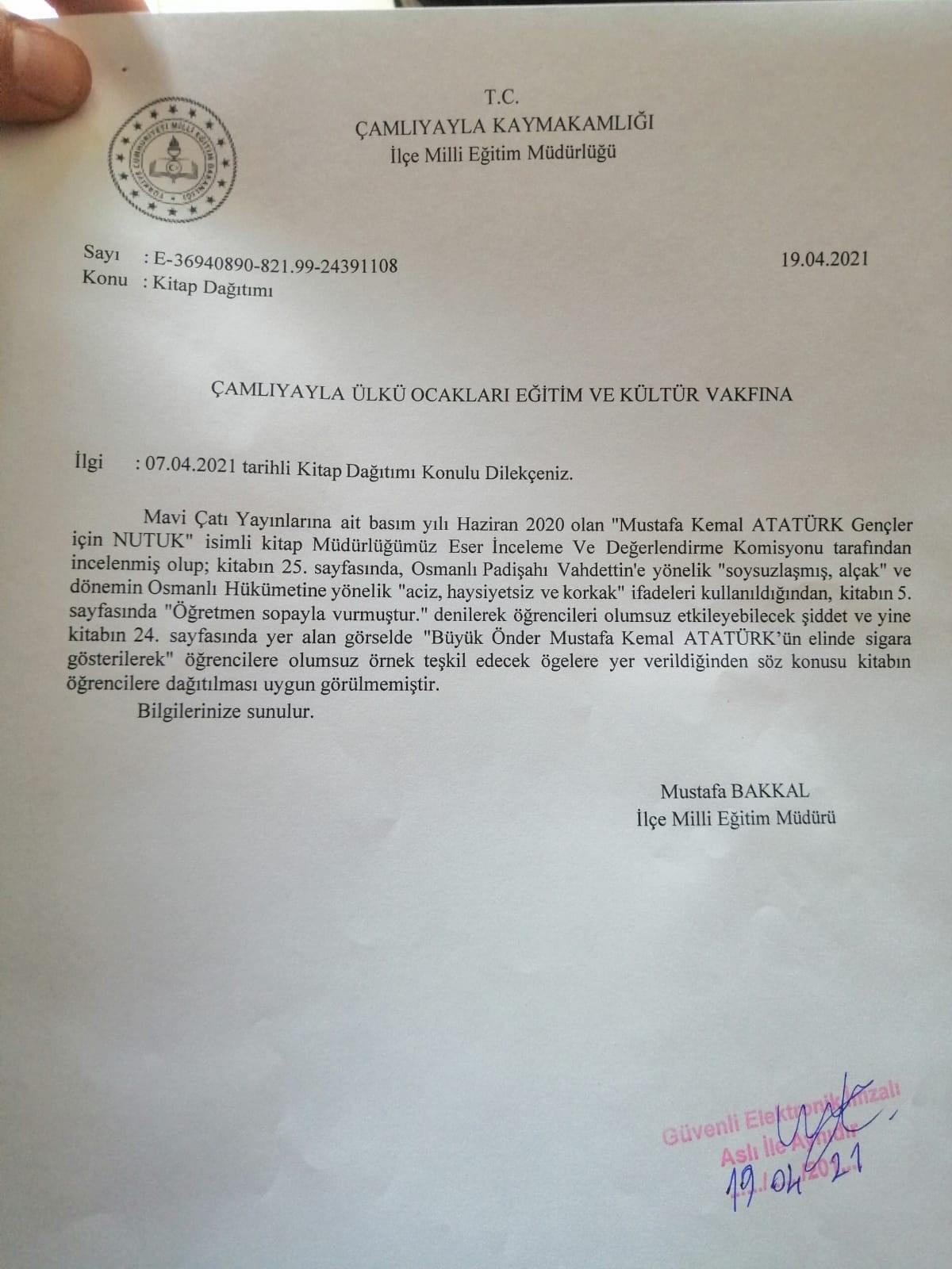 İlçe Milli Eğitim Müdürü Mustafa Bakkal imzalı yazıda, Mavi Çatı Yayınları’ndan çıkan Mustafa Kemal Atatürk Gençler İçin Nutuk” eserinin incelendiği ve belirtilerek, “Kitabın 25. Sayfasında Osmanlı padişahı Vahdettin’e yönelik ‘soysuzlaşmış, alçak’ ve dönemin Osmanlı Hükümetine yönelik ‘aciz, haysiyetsiz ve korkak’ ifadeleri kullanıldığından, kitabın 5. Sayfasında ‘Öğretmen sopayla vurmuştur’ denilerek öğrencileri olumsuz etkileyebilecek şiddet ve 24. Sayfasında yer alan görselde ‘Büyük Önder Mustafa Kemal Atatürk’ün elinde sigara ile gösterilerek’ öğrencilere olumsuz örnek teşkil edecek ögelere yer verildiğinden söz konusu kitabın öğrencilere dağıtılması uygun görülmemiştir” ifadelerine yer verildi.