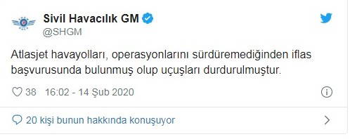 Sivil Havacılık Genel Müdürlüğü (SHGM) Twitter'dan yaptığı açıklama şirketin iflas başvurusunda bulunduğunu ve operasyonlarının durdurulduğunu bildirdi.