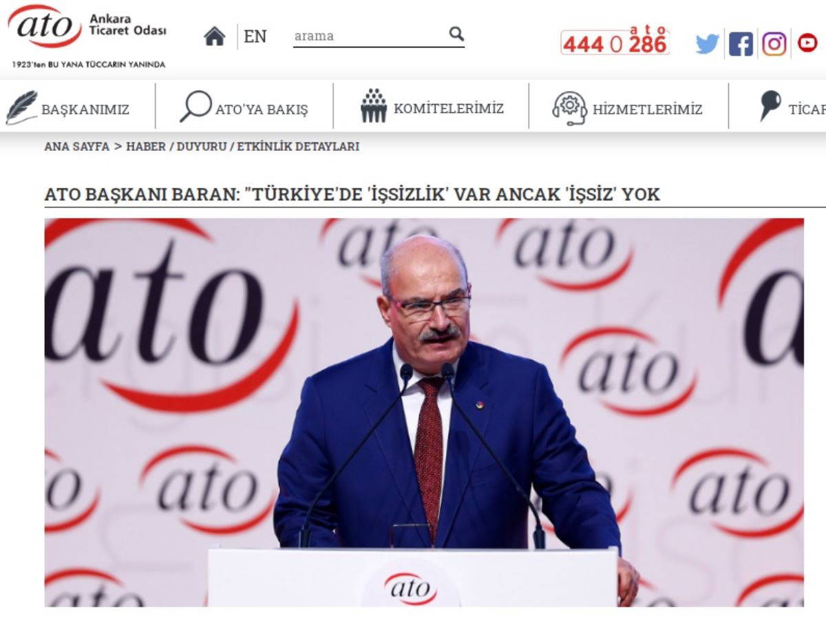 Baran'ın açıklaması, ATO'nun internet sitesinde "ATO Başkanı Baran: 'Türkiye'de işsizlik var ancak işsiz yok" başlığıyla yayımlandı.