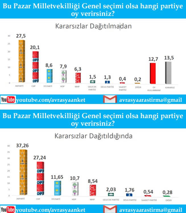 Genel seçimlere yönelik ankette yurttaşların yüzde 27,5’i AKP'ye oy vereceğini belirtirken, CHP’nin oy oranı ise yüzde 20,1 olarak belirtildi. Kararsızlar dağıtıldığında ise AKP'nin oy oranı yüzde 37,26'ya, CHP'nin oy oranı ise yüzde 27,24'e çıkıyor.
