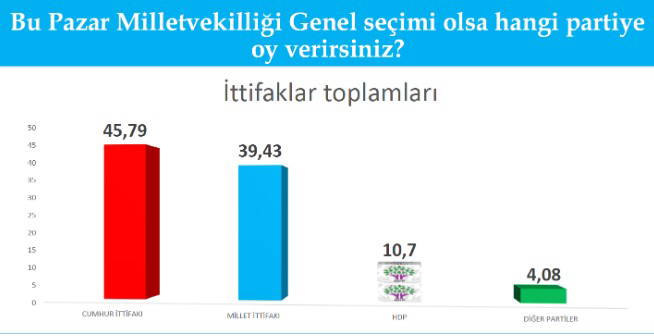 Ankete göre, Milletvekilliği Genel Seçimi'nde Cumhur İttifakı yüzde 45,79 oranında görülürken, Millet İttifakı yüzde 39,43 olarak görülüyor.