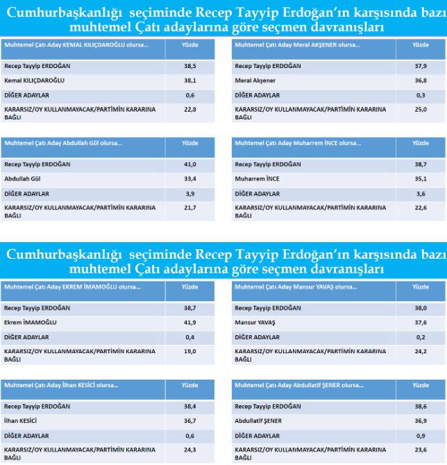 Ankete göre, olası bir Cumhurbaşkanlığı seçimlerinde AKP'li Cumhurbaşkanı Recep Tayyip Erdoğan karşısında muhalefet adayları oldukça yakın oy oranında. Erdoğan’nı geçen tek isim ise İstanbul Büyükşehir Belediye Başkanı Ekrem İmamoğlu oldu.