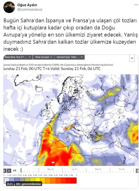 Meteoroloji ile yakından ilgilenen Oğuz Aydın, Twitter hesabından son hava tahminlerini paylaştı. Kuzey Afrika’daki Sahra Çölü’nden kalkan toz bulutu Avrupa’da kar olarak yere inmiş ve bazı Avrupa ülkelerine turuncu renkli kar yağmıştı. Söz konusu yaşananlar ilginç görüntülerin ortaya çıkmasına neden olmuştu.