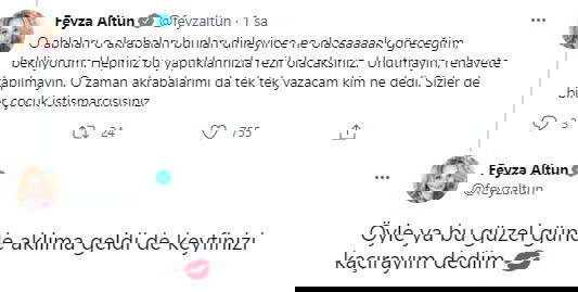 "O ablaları o akrabaları bunları dinleyince ne olacaaaaak göreceğim, bekliyorum. Hepiniz bu yaptıklarınızla rezil olacaksınız. Unutmayın, rehavete kapılmayın. O zaman akrabalarımı da tek tek yazacam kim ne dedi. Sizler de birer çocuk istismarcısısınız."