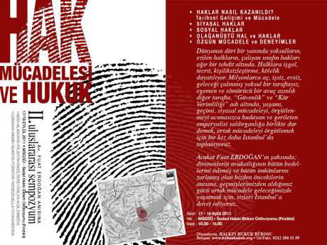 Halkın Hukuk Bürosu avukatlarından Fuat Erdoğan, 1994’de Beşiktaş’ta bir kafede otururken, ensesine sıkılan kurşunla öldürüldü. Erdoğan’ı öldürdükleri gerekçesiyle yargılanan polisler ise beraat ettiler. Erdoğan’ın anısı Halkın Hukuk Bürosu’nca bu yıl ikincisi düzenlenen sempozyumla yaşatılıyor. Sempozyuma, Chavez’in avukatı Vadell, Filistin Halk Kurtuluş Cephesi Genel Sekreteri Ahmet Saadat’ın avukatı Hassan Mahmud, Kolombiya’dan Boğata Baro Başkanı avukat Francisco Jouier Toloza Fuates de katılacak. Cumartesi günü saat 10.00’da açılışı yapılacak sempozyumda, “Haklar Nasıl Kazanıldı”, “Siyasal Haklar”, “Sosyal Haklar”, “Olağanüstü Hal ve Haklar”, “Özgün Mücadele ve Deneyimler” başlıklı konular ele alınacak. Yunanistan, Irak, Suriye, Lübnan, Almanya ve Türkiye’den hukukçuların da yer aldığı sempozyumun sonuç bildirgesi ise 19 Eylül Pazartesi açıklanacak.
