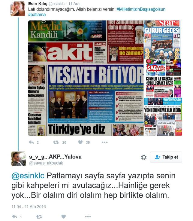 İstanbul Barosu avukatı Esin Kılıç, 10 Aralık 2016'da meydana gelen ve 39 polis ve insanların şehit olmasına yol açan Beşiktaş'taki terör saldırısını sonrası basın organlarının duyarsızlığını eleştirmek için Twitter'dan “Lafı dolandırmayacağım. Allah belanızı versin! #MilletimizinBaşısağolsun #patlama” mesajı attı. Yalova İl Özel İdare’de memur olarak çalışan Savaş Akbudak, bu mesajın altına “Patlamayı sayfa sayfa yazıpta senin gibi kahpeleri mi avutacağız... Hainliğe gerek yok... Bir olalım diri olalım hep birlikte olalım” diye yazdı.