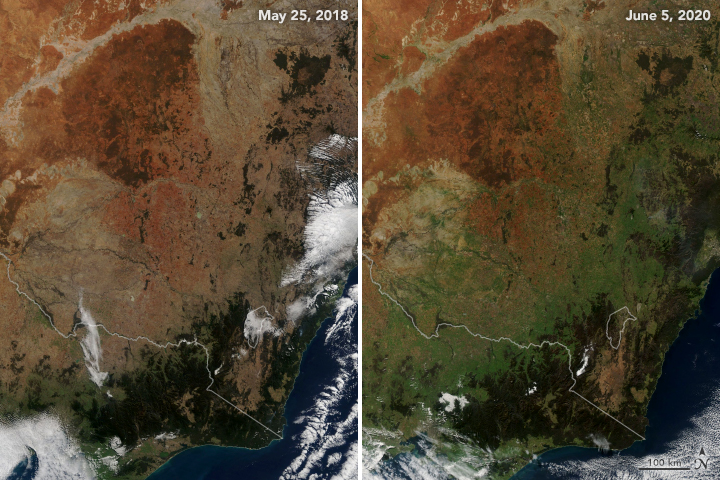 Yeni Güney Galler’in NASA’nın Aqua uydusu tarafından çekilen iki fotoğrafı eyalette kuraklık nedeniyle yaşananlarını oldukça çarpıcı bir şekilde gösteriyor. Aqua’nın Mayıs 2018’de çektiği fotoğrafta eyalette kahverengi görüntüler hakimken Haziran 2020’de çekilen fotoğrafta eskisine göre bölgenin çok daha fazla yeşillendiği görülebiliyor.