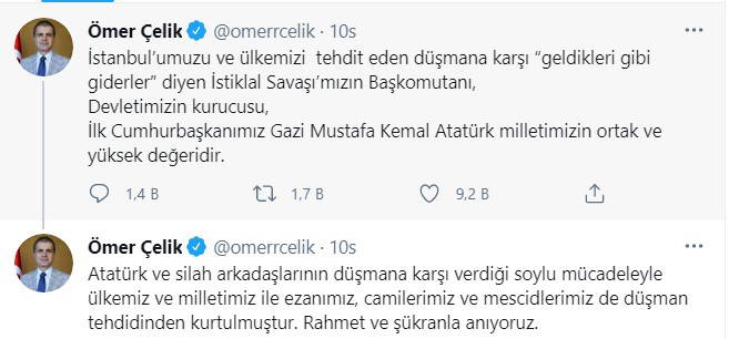 Yurttaşlardan gelen tepkiler üzerine sosyal medya hesabından açıklama yapan AKP Parti Sözcüsü Ömer Çelik, İstanbul’umuzu ve ülkemizi tehdit eden düşmana karşı 'geldikleri gibi giderler' diyen İstiklal Savaşı’mızın Başkomutanı, Devletimizin kurucusu, İlk Cumhurbaşkanımız Gazi Mustafa Kemal Atatürk milletimizin ortak ve yüksek değeridir. Atatürk ve silah arkadaşlarının düşmana karşı verdiği soylu mücadeleyle ülkemiz ve milletimiz ile ezanımız, camilerimiz ve mescidlerimiz de düşman tehdidinden kurtulmuştur. Rahmet ve şükranla anıyoruz'' ifadelerini kullandı.