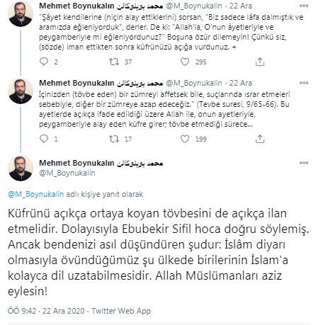 "Şâyet kendilerine (niçin alay ettiklerini) sorsan, “Biz sadece lâfa dalmıştık ve aramızda eğleniyorduk”, derler. De ki: “Allah’la, O’nun âyetleriyle ve peygamberiyle mi eğleniyordunuz?” Boşuna özür dilemeyin! Çünkü siz, (sözde) iman ettikten sonra küfrünüzü açığa vurdunuz.İçinizden (tövbe eden) bir zümreyi affetsek bile, suçlarında ısrar etmeleri sebebiyle, diğer bir zümreye azap edeceğiz." (Tevbe suresi, 9/65-66). Bu ayetlerde açıkça ifade edildiği üzere Allah ile, onun ayetleriyle, peygamberiyle alay eden küfre girer; tövbe etmediği sürece... Küfrünü açıkça ortaya koyan tövbesini de açıkça ilan etmelidir. Dolayısıyla Ebubekir Sifil hoca doğru söylemiş. Ancak bendenizi asıl düşündüren şudur: İslâm diyarı olmasıyla övündüğümüz şu ülkede birilerinin İslam'a kolayca dil uzatabilmesidir. Allah Müslümanları aziz eylesin!"