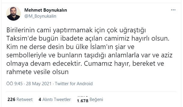 "Birilerinin cami yaptırmamak için çok uğraştığını" öne süren Mehmet Boynukalın, "Taksim'de bugün ibadete açılan camimiz hayırlı olsun. Kim ne derse desin bu ülke İslam'ın şiar ve sembolleriyle ve bunların taşıdığı anlamlarla var ve aziz olmaya devam edecektir" sözlerini sarf etti.