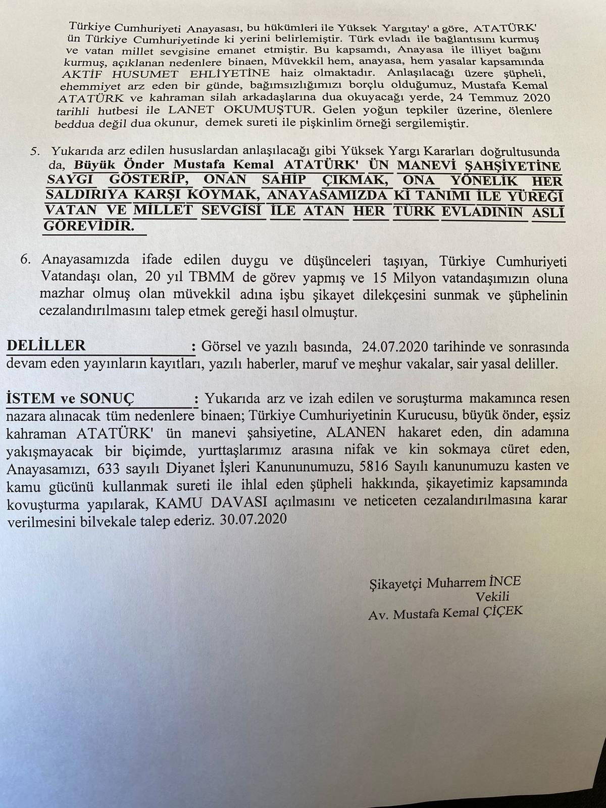 İnce’nin avukatı aracılığıyla İstanbul Cumhuriyet Başsavcılığı’na bulunduğu dava dilekçesinde, “Atatürk’ün manevi hatırasına hakaret” suçu yer aldı.