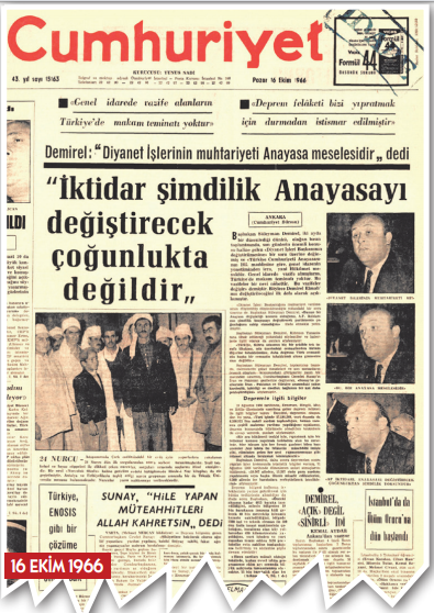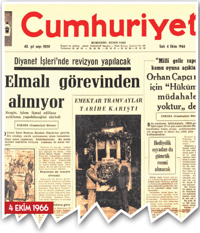 Bugünün Diyanet İşleri Başkanı üzerinden yaşanan tartışmaların kopyası dedirtecek cümleleri, 1966’nın son aylarında Cumhuriyet gazetesinin birinci sayfasından, dönemin Diyanet İşleri Başkanı Elmalı’nın atamasını yapan Demirel hükümetinin iradesi ile görevden alınmak zorunda kalınmasını manşet haberlerin içinden de okuyunca sizinle paylaşmadan geçemezdim.. İlk manşet haberin tarihi 4 Ekim 1966.