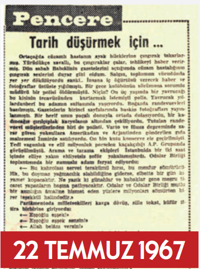 22 Temmuz 1967 tarihinde yayımlanmış Pencere köşesindeki yazısının başlığı “Tarih düşürmek için..” öngörebileceğiniz üzere çok sevilen mizah yanı ağır basan, bir o kadar da içinde bulunduğumuz ağır tabloyu yansıtan yazılarından.