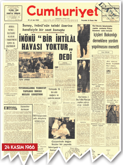 Toplumsal, siyasal örgütlenmelere yönelik çatışmacı baskılar, olayların her gün yenilerinin yaşanması karşısında kaygılandıran çatışmacılık ortamında İnönü’nün talebi üzerine kendisi ile görüşen Sunay’a ilişkin 24 Kasım tarihli haberde ise İnönü’nün “Bir ihtilal havası yoktur” dediği bildiriliyor. 29 Kasım tarihli Cumhuriyet’in manşeti AP Kongresi’nden, Elmalı üzerinden kavgalar çıktığı, tüzük hakkında da yer yer tartışmaların yaşandığı bilidiriliyor. TİP’in kapatılması isteniyor.