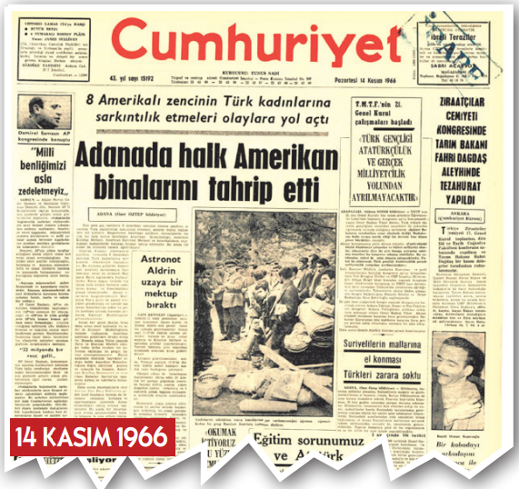 Oysa 6. Filo’nun bu konuda sabıkalı sayılacak kadar çok tahrikli, bilinçli çıkışları sadece ülkemize dönük değil, başka ülkeleri de hedef alır biçimde yaşanmıştır. İşte 14 Kasım tarihli Cumhuriyet’ten manşete çıkmış bir haber. 8 Amerikalının Türk kadınlarına sarkıntılık yapmaları olaylara yol açmış, Adana’da halk Amerikan binalarını tahrip etmiştir. Kuşkusuz 68 kuşağı gençliğinin en simgesel her yıldönümünde kutlamalarla anılan yanıtı, Dolmabahçe’den denize dökülme sahnesidir. 18 Temmuz tarihli Cumhuriyet’te bol fotoğraflı, ayrıntılı sahnelerle verilmiştir.