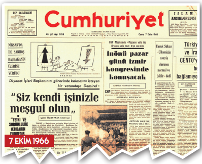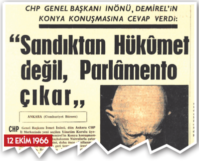 Niksar’da iki sarhoş, Başbakan’ın üzerine yürüyerek Elmalı’nın görevden alınmamasını istiyor. Demirel, “Siz kendi işinizle meşgul olunuz” yanıtını veriyor. İktidar ve muhalefetin, geleneksel Demirel-İnönü tartışmaları kapsamında İnönü, Demirel’in Konya konuşmasına yanıt verirken “Sandıktan hükümet değil, parlamento çıkar” yanıtını veriyor. 16 Ekim tarihli haberimizde ise aynı konuda kendisini zorlayan sorular karşısında, Diyanet İşleri’nin muhtariyetinin anayasa meselesi olduğunu söylüyor, “İktidar şimdilik anayasayı değiştirecek çoğunlukta değildir” diyor.