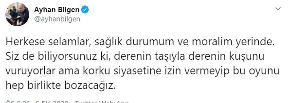 Bilgen, "Herkese selamlar, sağlık durumum ve moralim yerinde. Siz de biliyorsunuz ki, derenin taşıyla derenin kuşunu vuruyorlar ama korku siyasetine izin vermeyip bu oyunu hep birlikte bozacağız" dedi.