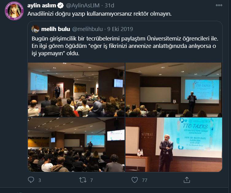 Melih Bulu'nun 2019 yılında Haliç Üniversitesi'nde bir öğrenci buluşması etkinliğinin ardından paylaştığı yazım hatalarıyla dolu ve güçlükle anlaşılan sosyal medya paylaşımını kendi hesabından retweet eden Aylin Aslım, "Ana dilinizi doğru yazıp kullanamıyorsanız rektör olmayın" notu düştü.