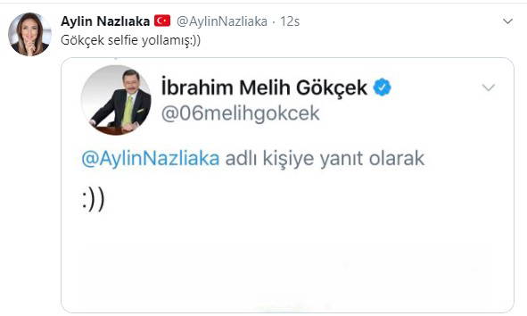 Görevden el çektirilen eski Belediye Başkanı Melih Gökçek, Nazlıaka’nın paylaşımına boş damacana fotağrafı ve gülücük işaretiyle yanıt verdi. Aylin Nazlıaka da Gökçek’ten gelen damacana fotoğrafını “Gökçek selfie yollamış” notuyla yanıtladı.