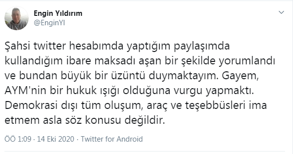 AYM üyesi Yıldırım, “Şahsi Twitter hesabımda yaptığım paylaşımda kullandığım ibare maksadı aşan bir şekilde yorumlandı ve bundan büyük bir üzüntü duymaktayım. Gayem, AYM'nin bir hukuk ışığı olduğuna vurgu yapmaktı. Demokrasi dışı tüm oluşum, araç ve teşebbüsleri ima etmem asla söz konusu değildir” diye yazdı.