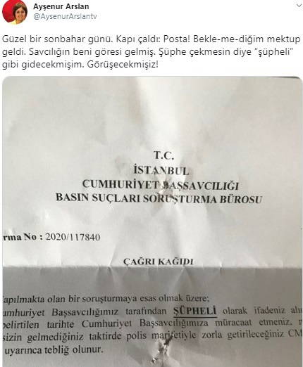 İstanbul Cumhuriyet Başsavcılığı Basın Suçları Bürosu tarafından kendisine gönderilen çağrı kağıdının fotoğrafını Twitter hesabından paylaşan Ayşenur Arslan, "Güzel bir sonbahar günü. Kapı çaldı: Posta! Bekle-me-diğim mektup geldi. Savcılığın beni göresi gelmiş. Şüphe çekmesin diye “şüpheli” gibi gidecekmişim. Görüşecekmişiz!" diye yazdı.