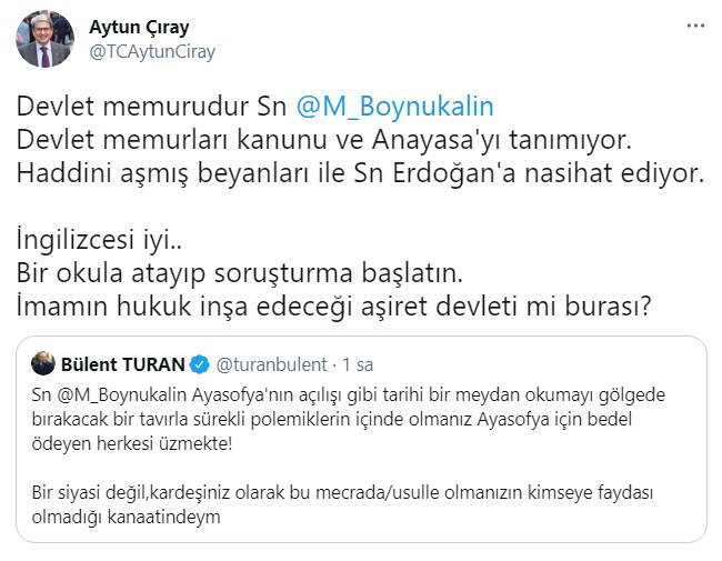 Aytun Çıray Twitter'dan AK Parti Grup Başkanvekili Bülent Turan'ın Boynukalın'ın polemiklerin içinde olmasının 'Ayasofya için bedel ödeyen herkesi üzdüğünü' söyleyediği ifadelerini alıntılayarak şu açıklamada bulundu: