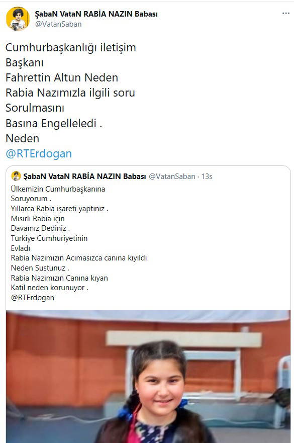 Baba vatan Twitter hesabından yaptığı paylaşımda Cumhurbaşkanı Recep Tayyip Erdoğan'a seslenerek, Altun'un basına Rabia Naz haberlerinin engellenmesi hakkında talimat verdiğini iddia etti ve "Neden?" diye sordu.