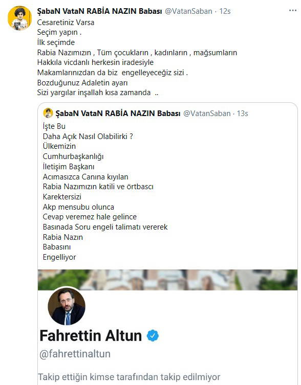 Giresun'da şüpheli şekilde ölen 11 yaşındaki Rabia Naz Vatan'ın babası Şaban Vatan, Cumhurbaşkanlığı İletişim Başkanı Fahrettin Altun tarafından Twitter'da engellendi. "Seçim yapın" çağrısında bulunan Baba Vatan, "Vicdanlı herkesin iradesiyle makamlarınızdan da biz engelleyeceğiz sizi" ifadelerini kullandı.