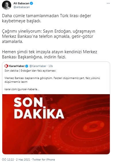 Babacan, “Sayın Erdoğan, uğraşmayın Merkez Bankası'na telefon açmakla, getir-götür atamalarla. Hemen şimdi tek imzayla atayın kendinizi Merkez Bankası Başkanlığına, indirin faizi” dedi.