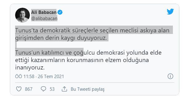 DEVA Partisi Genel Başkanı Ali Babacan, Tunus’ta yaşanan son gelişmelerle ilgili Twitter hesabından açıklama yaptı.