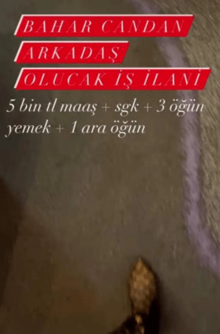 Yalnızlığından şikayet eden ve 5 bin TL karşılığında kendisine bir arkadaş aradığını açıklayan fenomen isim, "Bahar Candan'a arkadaş olacak iş ilanı. 5 bin TL maaş + sigorta + 3 öğün + 1 ara öğün" şeklinde bir paylaşımda bulundu.