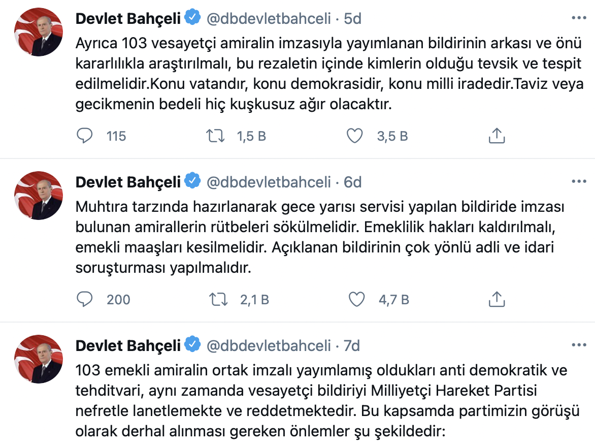 Twitter hesabından açıklamada bulunan Bahçeli, 103 amirali hedef aldı. Bahçeli, açıklamayı yapan emekli amirallerin rütbelerinin sökülmesini talep etti.