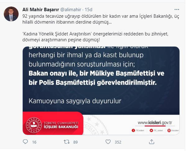 CHP Mersin Milletvekili Ali Mahir Başarır, ''92 yaşında tecavüze uğrayıp öldürülen bir kadın var ama İçişleri Bakanlığı, üç hilalli dövmenin itibarının derdine düşmüş.‘Kadına Yönelik Şiddet Araştırılsın’ önergelerimizi reddeden bu zihniyet, dövmeyi araştırmanın peşine düşmüş'' diyerek bakanlığın soruşturmasına tepki gösterdi.