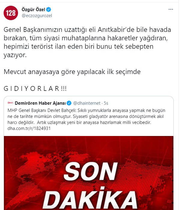 Bahçeli’nin sözlerinin yer aldığı haber metninin görüntüsünü paylaşan Özgür Özel, sosyal medya üzerinden, “Genel Başkanımızın uzattığı eli Anıtkabir'de bile havada bırakan, tüm siyasi muhataplarına hakaretler yağdıran, hepimizi terörist ilan eden biri bunu tek sebepten yazıyor. Mevcut anayasaya göre yapılacak ilk seçimde gidiyorlar" şeklinde yanıt verdi.