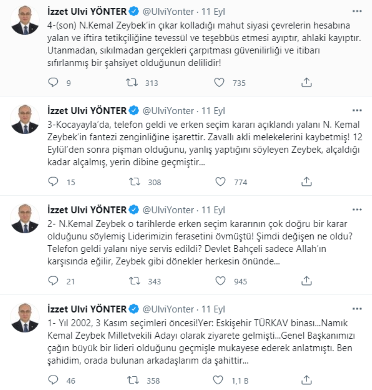 Yönter, ''Namık Kemal Zeybek o tarihlerde erken seçim kararının çok doğru bir karar olduğunu söylemiş Liderimizin ferasetini övmüştü! Şimdi değişen ne oldu? Telefon geldi yalanı niye servis edildi? Devlet Bahçeli sadece Allah'ın karşısında eğilir, Zeybek gibi dönekler herkesin önünde'' ifadelerini kullandı.