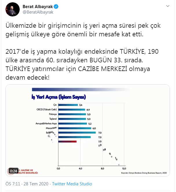 Hazine ve Maliye Bakanı Berat Albayrak, Twitter hesabından açıklama yaptı. Albayrak açıklamasında, "Ülkemizde bir girişimcinin iş yeri açma süresi pek çok gelişmiş ülkeye göre önemli bir mesafe kat etti. 2017'de iş yapma kolaylığı endeksinde Türkiye 190 ülke arasında 60'ıncı sıradayken bugün 33'üncü sırada. Türkiye yatırımcılar için cazibe merkezi olmaya devam edecek " ifadelerini kullandı.