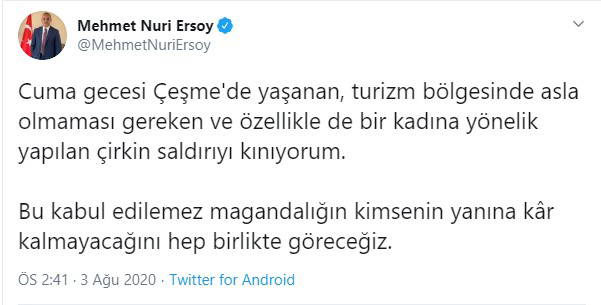 Kültür ve Turizm Bakanı Mehmet Nuri Ersoy, sosyal medyadan yaptığı açıklamada, “Cuma gecesi Çeşme’de yaşanan, turizm bölgesinde asla olmaması gereken ve özellikle de bir kadına yönelik yapılan çirkin saldırıyı kınıyorum. Bu kabul edilemez magandalığın kimsenin yanına kar kalmayacağını hep birlikte göreceğiz” mesajını verdi.